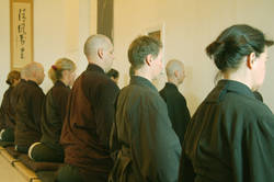 Am Ende der Sitzperiode, die circa 50 Min. dauert, findet eine kurze Zeremonie statt, während der einige Sutren rezitiert werden. Danach wird im Teeraum in traditioneller Weise eine Reissuppe (Genmai) serviert und zusammen eingenommen. Wer Zeit hat bleibt noch für ein kurzes Samu (Aufräumarbeiten) und auf eine Tasse Tee oder Kaffee. Je nach dem wie der persönliche Zeitplan ist, kann man sowohl schon direkt nach dem Zazen, als auch nach der Zeremonie das Dojo verlassen.